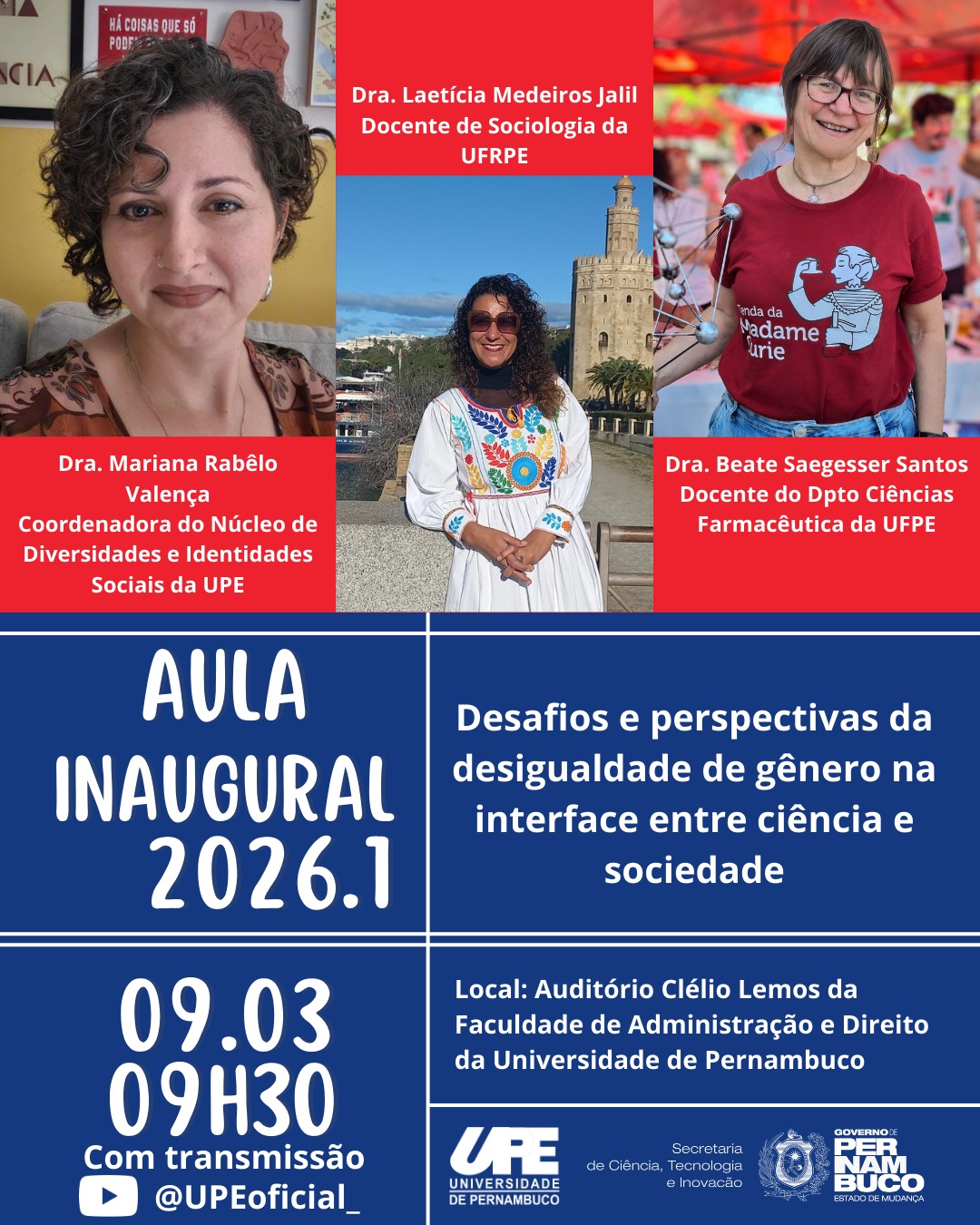 A programação inclui a mesa-redonda “Desafios e perspectivas da desigualdade de gênero na interface entre ciência e sociedade”, que reunirá como convidadas a Professora Dra. Beate Saegesser Santos, do Departamento de Ciências Farmacêuticas da Universidade Federal de Pernambuco (UFPE), e a Professora Dra. Laetícia Medeiros Jalil, docente de Sociologia da Universidade Federal Rural de Pernambuco. A mediação será conduzida pela também Professora Dra. Mariana Rabêlo Valença, coordenadora do Núcleo de Diversidades e Identidades Sociais da UPE.