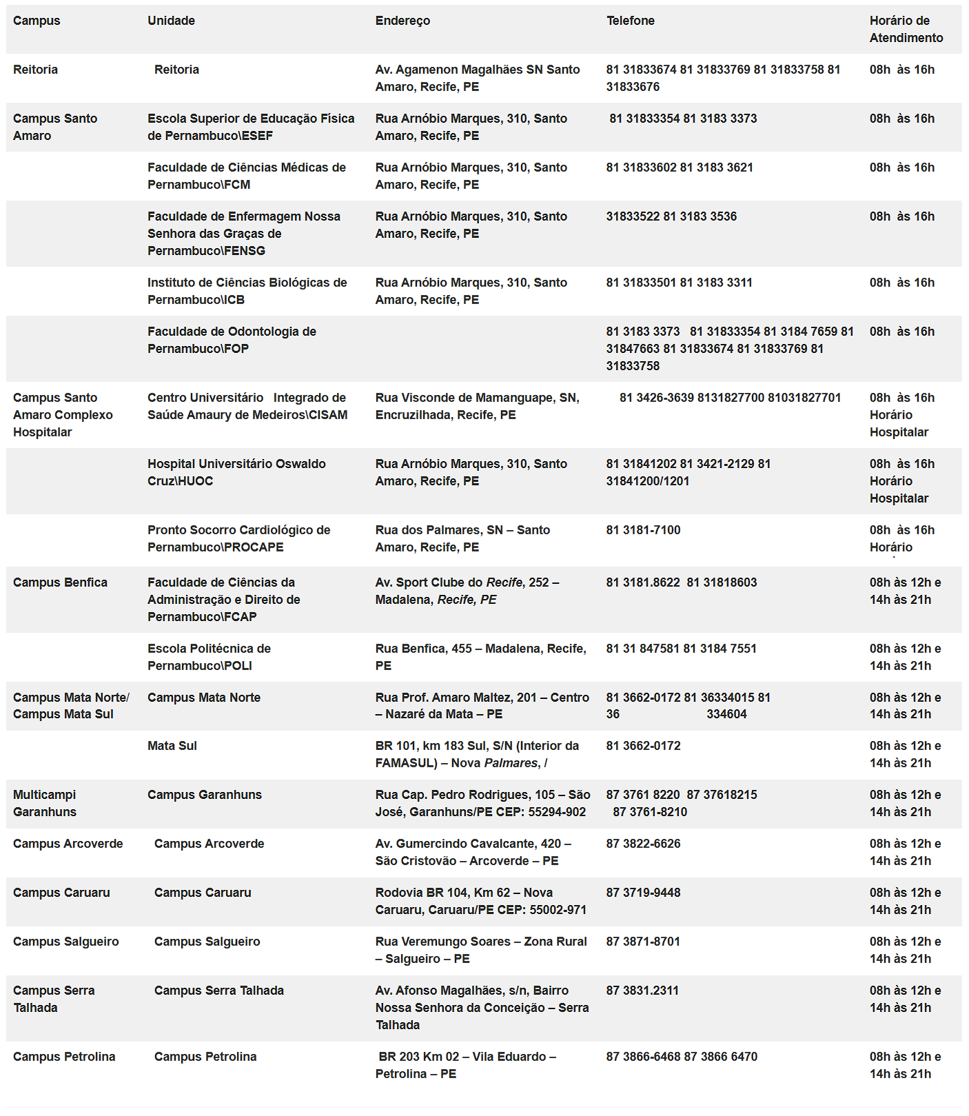 | Complexo Hospitalar | Centro Integrado Universitário de Saúde Amaury de Medeiros – Cisam Hospital Universitário Oswaldo Cruz – HUOC Pronto Socorro Cardiológico Universitário Luiz Tavares – Procape |